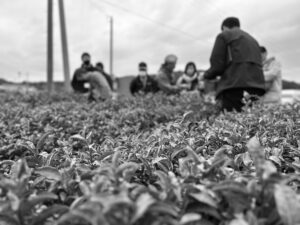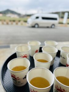 ウェルカムほうじ茶でお茶を飲んでいただきながら工場横の茶畑でご説明させていただきました。